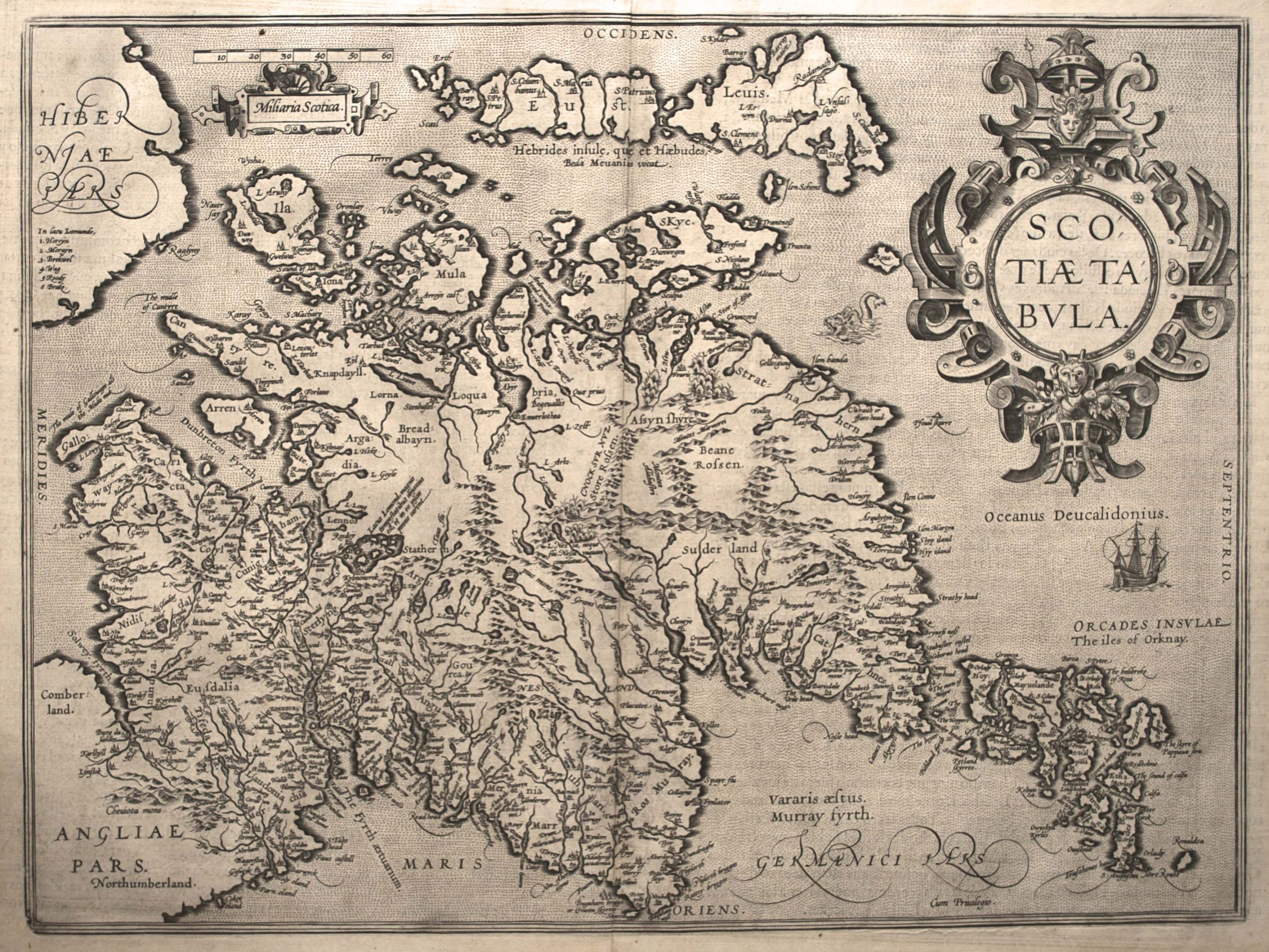 Uncoloured map of Scotland from the ca 1612 Spanish edition of Abraham Ortelius’ landmark atlas “Theatrum Orbis Terrarum”, the first modern atlas of the world. This map, which was included in the Ortelius atlas since 1573, is based on Mercator’s 1564 eight sheet wall map and is oriented to the west as was common in very early maps of the British Isles. It is decorated with a large strap-work title cartouche, a sea monster and a sailing ship. A description of Scotland appears on the verso in Spanish. The map is a strong, dark impression with wide margins in excellent condition. 35.5 cm x 47.5 cm