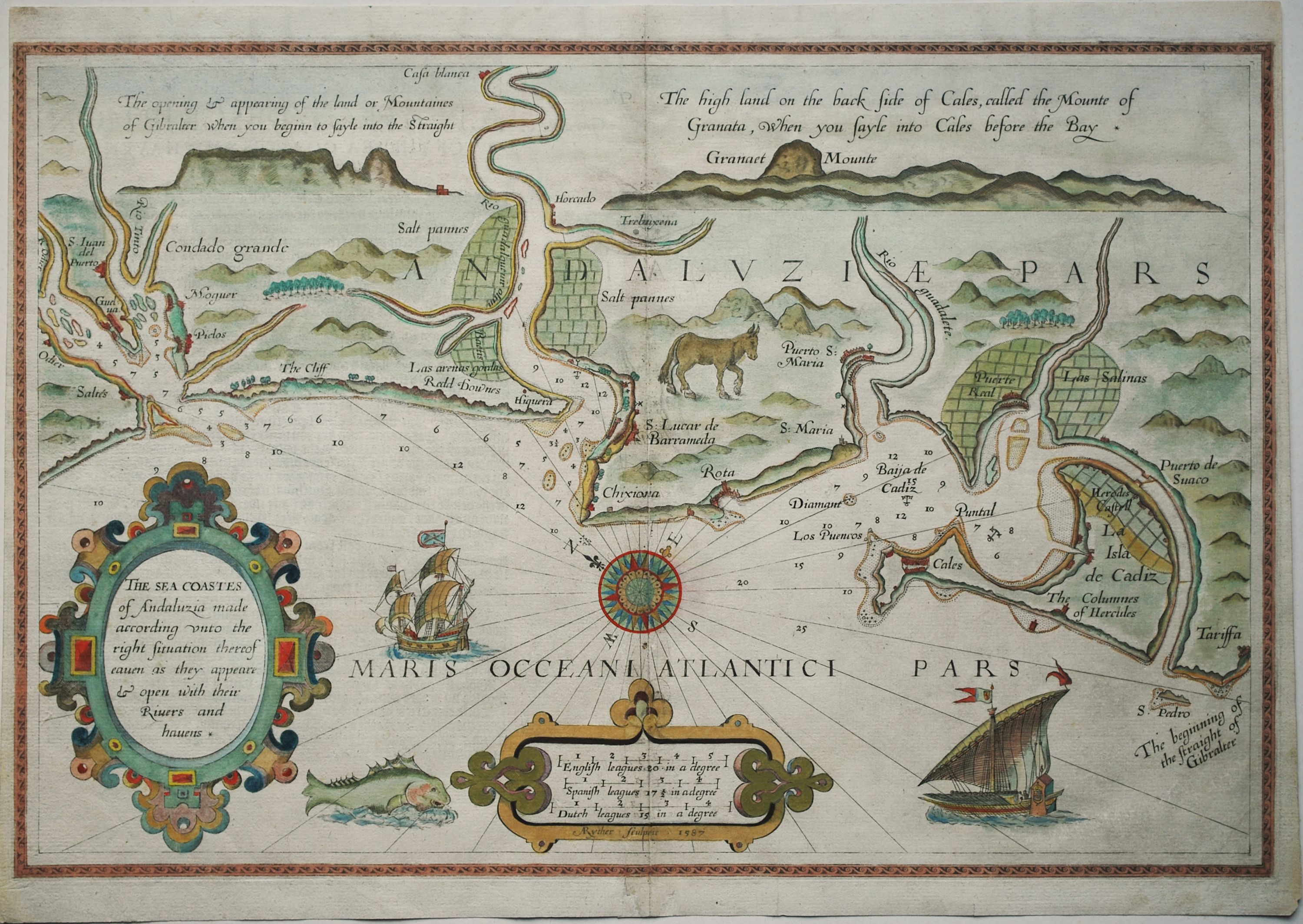 Coloured sea chart of the south-west coast of Spain from the English version of Waghenaer’s landmark atlas of sea charts “The Mariners Mirrour”. The atlas, which was originally published in Dutch in 1584 and entitled “Spieghel der Zeervaerdt”, was translated into English in 1588 by Anthony Ashley, the Clerk to the Privy Council. This chart, which was engraved by Augustine Ryther and dated 1587, shows the Andalucian coast from island of Sancti Petri and the very start of the Straight of Gibraltar in the east to the town of Huelva and the Odiel River to the west. The chart is decorated with a compass rose, a naively drawn very large fish and two sailing ships. A description of the region appears on the verso in English. Other than a some minor repairs to the margin not affecting the engraved image, a finely coloured example in excellent condition. 33.5 cm x 50.5 cm