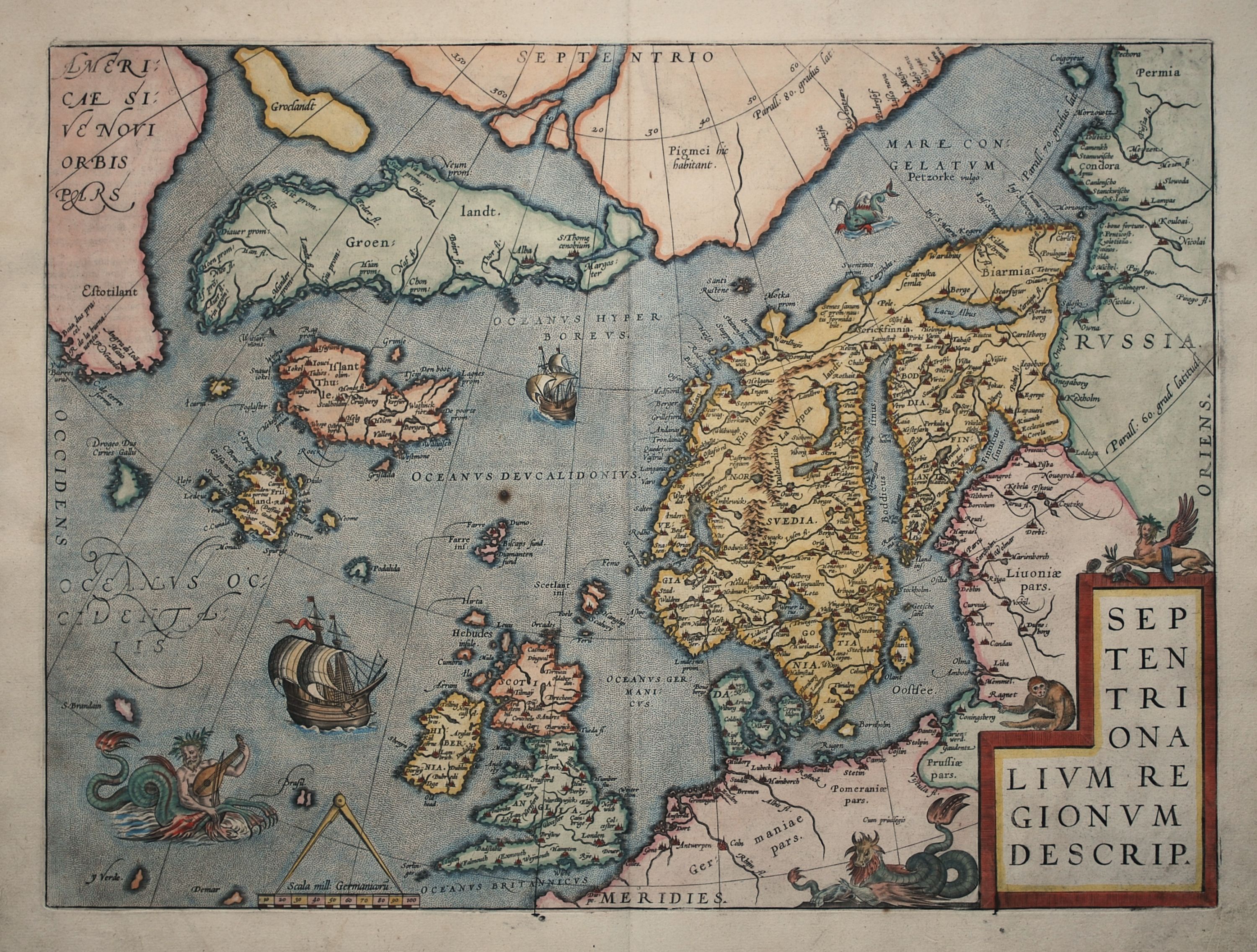 Coloured map of North Atlantic from the 1601 Latin edition of Abraham Ortelius’ landmark atlas “Theatrum Orbis Terrarum”, the first modern atlas of the world. This map, which was included in the Ortelius atlas since its inception in 1570, is based on the work of several mapmakers including Mercator Zeno and Olaus Magnus. Covering the area from Russia in the east to North America in the west, the map shows a fairly accurate view of Scandinavia, Northern Europe and the British Isles, a largely imaginary depiction of the polar region, Greenland and Iceland (shown as Thule) and several mythical islands such as Friesland and St.Brendan. A description of the region appears on the verso in Latin. Other than a repaired rust mark and a few pinholes in the centrefold, the map is a finely coloured, dark impression in very good condition. 36 cm x 49 cm