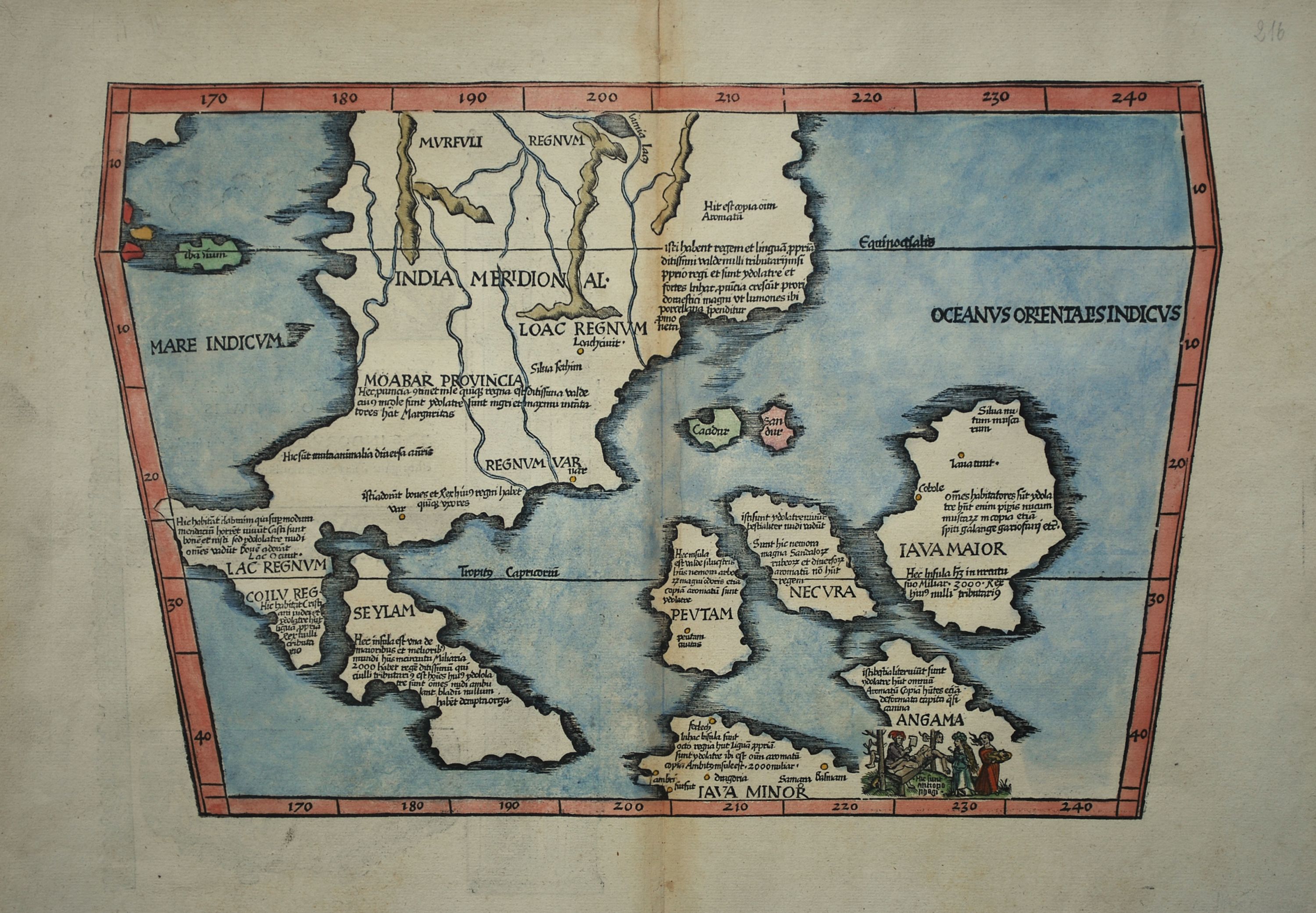 Wood-cut map of the East Indies by Lorenz Fries from the second edition Ptolemy’s Geographia printed by Johannes Gruninger and published in Strasbourg by Johann Koberger in 1525. The map, which is the first printed map to focus on the region of Indochina and the East Indies, is done in the “modern” style with its geography principally based on the 1507 Waldseemuller world map and using terminology taken from Marco Polo’s travelogue. Certain portions of the region are perhaps just recognizable, such as the Malayan Peninsula, Sumatra (Seylam) and Java (Java Minor). On “Angama” at the bottom of the map is a curious scene of a group of cannibals in the process of dismembering an unfortunate victim. Verso is entitled “Tabula Moder. Indiae Orientalis” with a three line summary of the region in Latin framed within decorative borders. Other than some light discolouration of the centrefold and soiling to the wide margins, the map is a dark impression in very good condition. 28 cm x 42.5 cm
