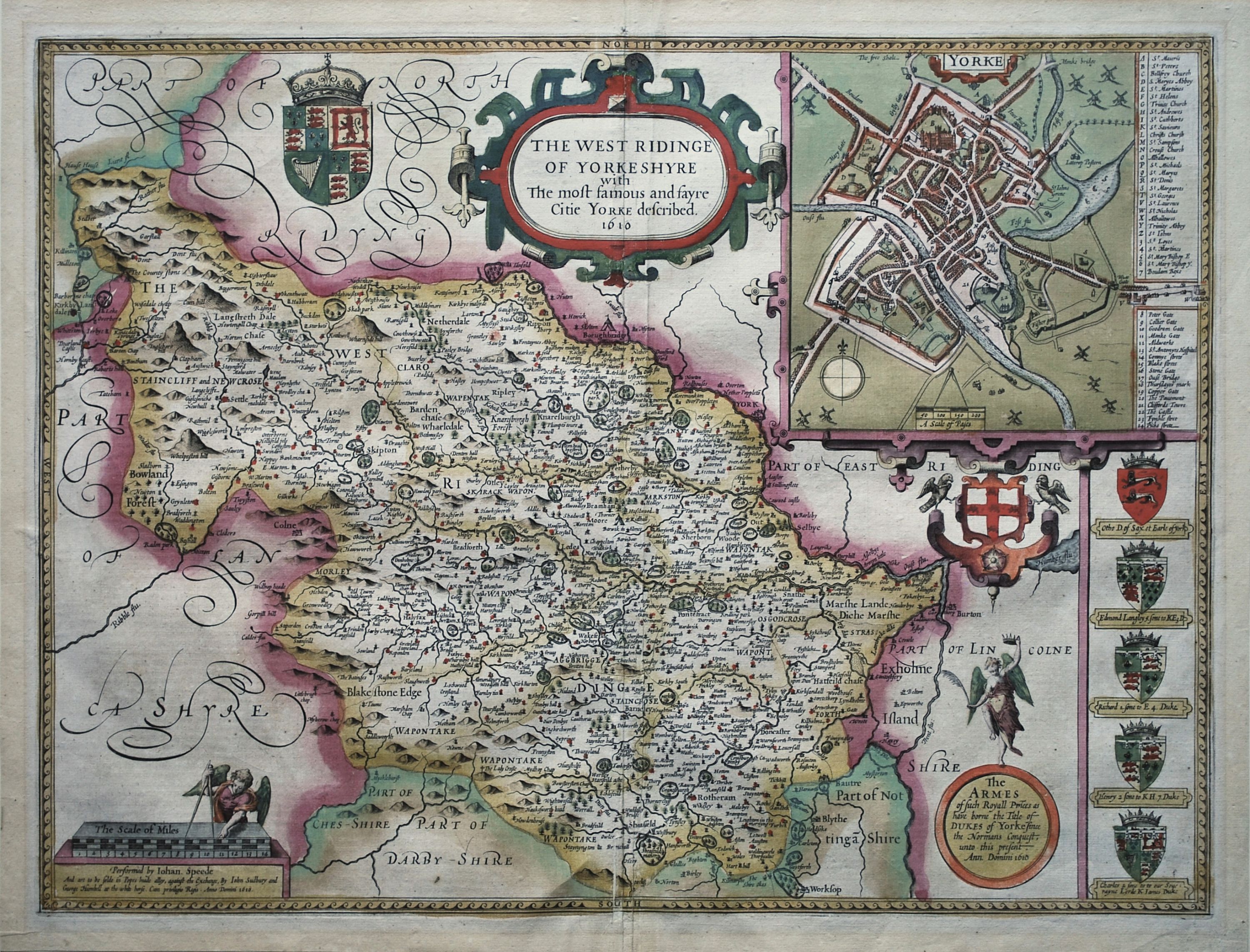A lovely old coloured example of John Speed’s map of the West Riding of Yorkshire from the rare Sudbury and Humble Latin edition of “Theatre of the Empire of Great Britain”. Inset is a large detailed plan of York together with a key indicating 46 landmarks and places of interest in the city. Also included are the royal coat of arms, the arms of the noble families of the county and a decorative strap-work title cartouche. A description of the region appears on the verso in Latin. The map is in excellent condition. 38.5 cm x 51 cm