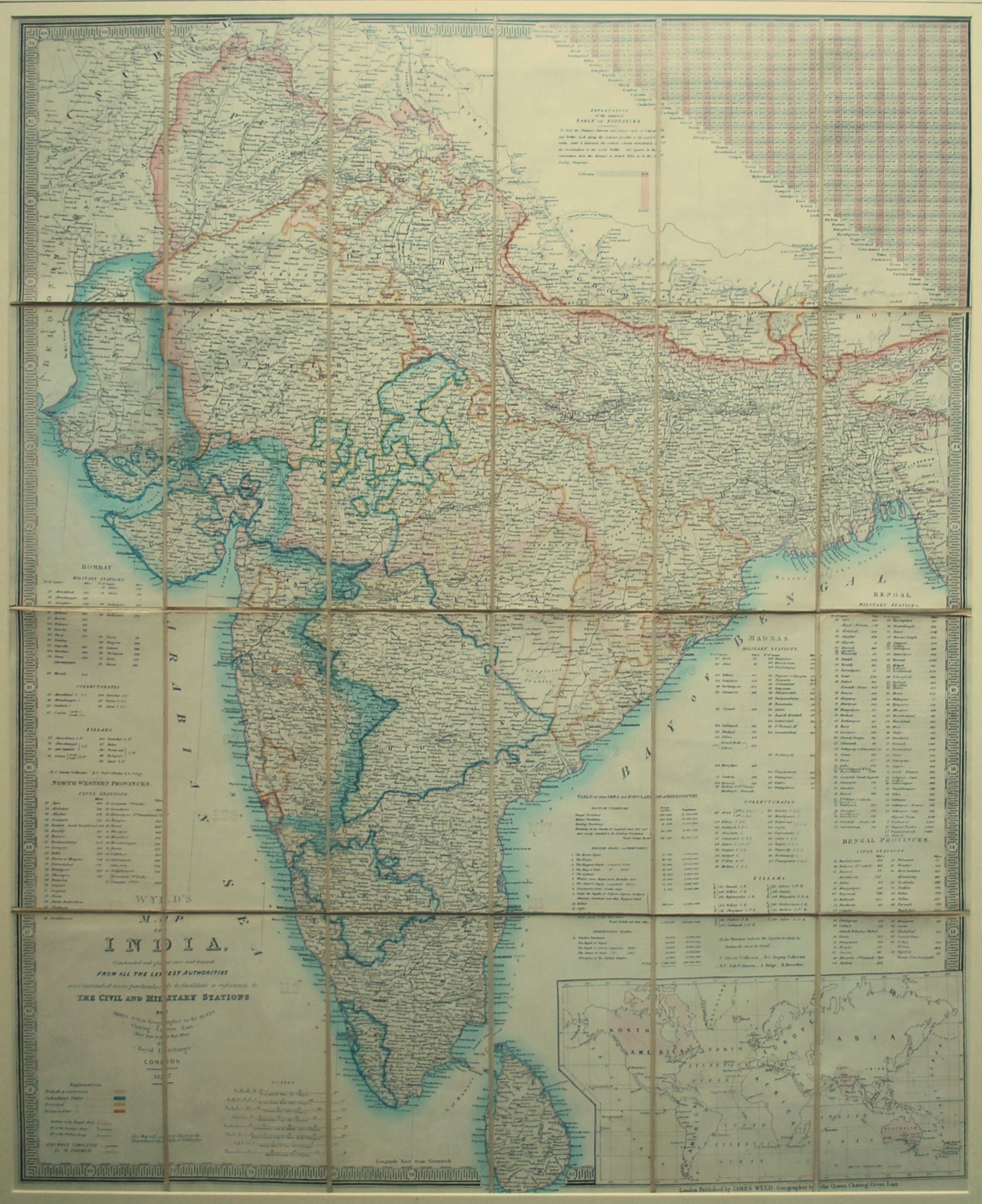 Outline coloured, large-scale folding map of India by James Wyld that was published to be sold separately in the year of the Indian Rebellion against the rule of the British East India Company. The map has an enormous amount of detail in both the cartography of the Indian sub-continent and tables surrounding the map. India is divided into states with each one identified in a key (bottom left) by its outline colour as either a (i) British Possession (ii) Subsidiary State (iii) Protected State or (iv) Independent State. Other information shown in the keys and tables surrounding the map include the location and area in square miles of Military Stations, Civil Stations, Zillahs (Administrative Districts) and Collectorates (District Revenue Collection Offices) throughout the sub-continent; population and area in square miles of the regions of Hindoostan; railways – both completed and in process (sanctioned); and Stations of the Bengal, Bombay and Madras Armies. A small world map in the bottom right displays the extent of the mid-19th century British Empire with its territories highlighted in pink. This folding map has been backed with linen and is in very good condition. 84 cm x 67.5 cm